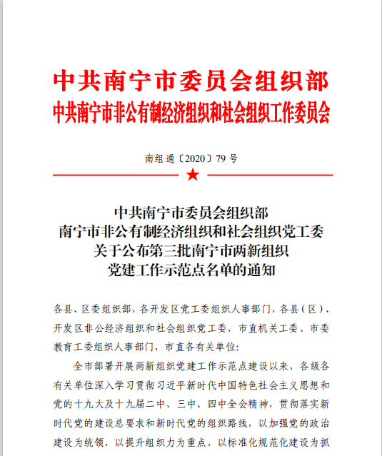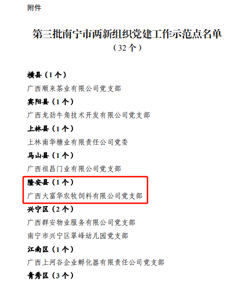 9月15日,中共南寧市委員會組織部、中共南寧市非公有製經濟組織和社會組織工作委員會南組通〔2020〕79號《關於公布第三批南寧市兩新組織黨建工作示範點名單的通知》,廣西大富華農牧香蕉APP官网下载有限公司黨支部確定為南寧市兩新組織黨建工作示範點。