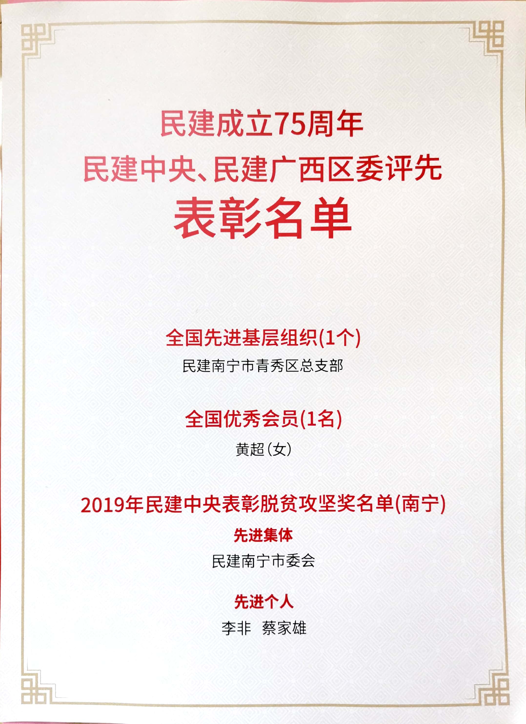 12月26日,中國民主建國會廣西壯族自治區委員會紀念民建成立75周年暨廣西民建優秀會員表彰大會在南寧市鳳凰賓館隆重舉行。中國民主建國會廣西第九屆委員會農業與農村委員會副主任、興寧總支副主委、香蕉视频下载APP集團李非董事長榮獲“廣西民建優秀會員”稱號。